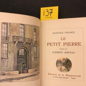 FRANCE (Anatole). — Le Petit Pierre. — Illustré par Clément Serveau. — P., Edit. de la Mappemonde, 1935, 8°, demi-maroquin vert à coins, dos à 5 nerfs, auteur, titre, fleurons et roulettes dorés, double filet à froid de séparation sur...