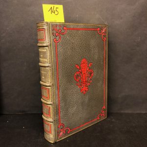 et date dorés, listel de maroquin rouge en rectangle entre les nerfs encadré d’un filet doré, listel de maroquin rouge d’encadrement sur les plats avec grand fleuron aux angles, grande fleur de lys mosaïquée en maroquin rouge au centre du plat supér., double filet doré sur les coupes et les coiffes, contreplats en maroquin rouge ornés entièrement d’un semé de fleurs de lys dorées, dans un cadre de filets et roulettes dorés, gardes en soie moirée rouge, tranches dorées sur témoins, couv. et dos cons., prospectus relié in-fine, étui bordé (trace de cire blanche) (reliure signée Ch. De Samblanx).