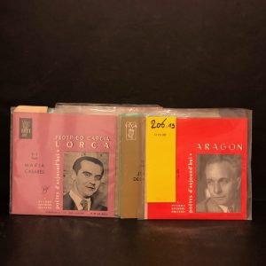 "POÈTES D'AUJOURD'HUI". — Ensemble de 19 disques 45 tours édités par Seghers. — Comprend : Aragon, Baudelaire, Carco, Cendrars, Chénier, Cocteau, de Musset, Desnos, Eluard, Hugo, Jammes, Lorca, Mauriac, Michaux, Péguy, Rimbaud, Soupault,...