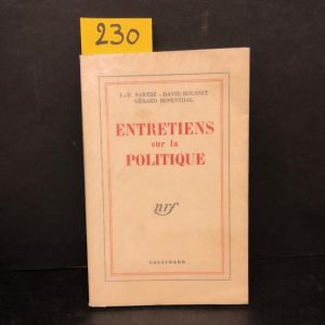 Ex. de tête enrichi d'un envoi.- SARTRE (Jean-Paul), ROUSSET (D.) et ROSENTHAL (G.). — Entretiens sur la politique. P., NRF, 1949, in-12, br.