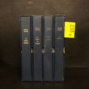 IDEM. Les Innocents. P., Presses de la Cité, 1972, 8°, 184 p., en feuilles, non coupé, couv. rempliée, chemise rigide (mors fendillés) et étui édit. en skyvertex bleu nuit. Édit. orig. 1/110 ex. num. de luxe, seul grand papier (Menguy, 247)./ Ens. 4 vol.