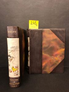 TOUCHET.- SWIFT (J.). — Voyages de Gulliver dans des contrées lointaines. — Introduction de Walter Scott. — Illustrations par Jacques Touchet. — Paris, Kra, 1929-30, 4 tomes reliés en 2 vol. 4°, demi-chagrin brun à coins, dos ornés en...