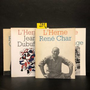Raymond QUENEAU. P., L'Herne, 1975, 4°, br. Bien complet du feuillet volant figurant un dessin de Jean Dubuffet./ Jean DUBUFFET. Même édit., 1973, 4°, br. (fin retrait de la pellicule sur la tranche supérieure de la couv.)./ René CHAR. Même...