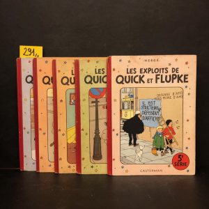 HERGE. — Les Exploits de Quick et Flupke. 1ère série. — Tournai, Casterman, 1950, 4°, demi-toile rouge (cart. frotté, traces d'usage) (BDM : 4e plat B4)./ IDEM. 2e série. Même édit., 1950, 4°, demi-toile rouge (cart. frotté, traces...