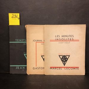 IVANOVSKY.- LECOMTE (Marcel). — Les Minutes insolites. — Illustrations de Elisabeth Ivanovsky (3 bois h. t. gravés en noir). — Brux., à l'Enseigne du Paradis Perdu, 1936, pet. 4°, 53 p., br., couv. rempliée (manque en queue de dos, 1 page...