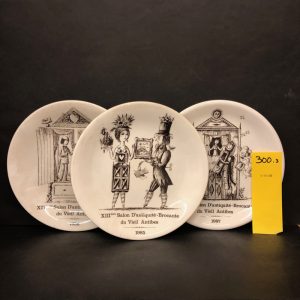 PEYNET (Raymond). — "Salon d''antiquité-brocante du Vieil Antibes" (1985-1987). — Lot de 3 assiettes en céramique blanche éditées pour le Salon figurant les Amoureux. Dim. : (3 x) 24 x 24 cm (assiette de 1986 superficiellement craquelée).