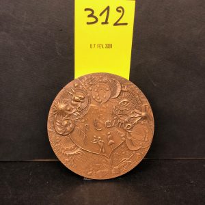 PEYNET (Raymond). — "Je t'aime". — Médaille en bronze portant un poinçon sur la tranche. Avers : jolie scène en relief figurant les Amoureux. Revers : autoportrait de Peynet. Dim. : 10 x 10 x 0,6 cm.