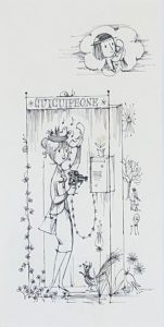 PEYNET (Raymond). — "Nid d'amoureux". — Encre de Chine sur papier, rehaussée à la gouache, montée sous passe-partout et cadre noir laqué en bois. Dim. cadre : 27 x 28 cm ; sujet : 15 x 15,5 cm.