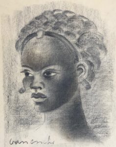 VAN ESSCHE (Maurice). — "Femme africaine". — Dessin au fusain, titré et signé au crayon, montée sous cadre en bois.— Dim. cadre : 55 x 45 cm ; sujet : 40 x 30 cm (rousseurs).