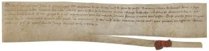 guerre de cent ans. Pièce sur vélin, 27 juin 1373 ; vélin obl. in-4 (5,5 x 27,5 cm), fragment de sceau de cire rouge aux armes.
