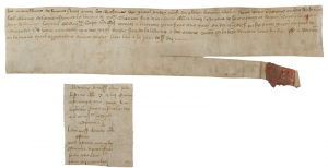 guerre de cent ans. Pièce sur vélin, Carentan 1er février 1387 ; vélin obl. in-4 (5,5 x 26,5 cm) avec fragment de cachet de cire rouge aux armes, et vélin joint de 7 x 5,5 cm.