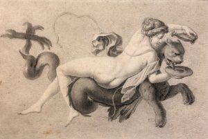 NON IDENTIFIÉ. — "Capricorne et Verseau". — Mine de plomb sur papier, signée au coin infér. gauche (signature illisible), montée sous passe-partout vert à liseré doré et cadre en bois. — Dim. passe-partout : 21,5 x 31,5 cm ; sujet : 14 x...