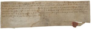 guerre de cent ans. Pièce sur vélin, Saint-Omer 27 mai 1388 ; vélin obl. in-4 (7,5 x 26 cm), sceau de cire rouge aux armes (mouill.).