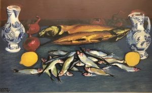 DEVOS (Léon). — "Nature morte aux harengs et aux citrons". — Huile sur toile, signée au coin infér. gauche, montée sous cadre doré en bois. — Dim. cadre : 42 x 65 cm ; sujet : 38 × 61 cm.