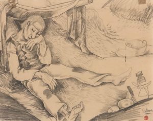 EEKMAN (Nicolas). — "L'Homme endormi". — Dessin au fusain, signé au coin infér. droit, monté sous passe-partout blanc et cadre en bois. — Dim. cadre : 45 x 52 cm ; sujet : 23 x 29,5 cm (taches au bord supér., petits éclats dans le cadre).
