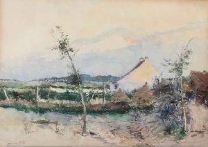 ELLE (Edouard). — "Vue de village". — Aquarelle sur papier, signée au coin infér. gauche et montée sous passe-partout et cadre doré en bois. — Dim. cadre : 64,5 x 80 cm ; sujet : 36 x 52 cm.