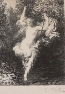 FANTIN-LATOUR (Henri-Théodore). — "Jeune femme nue sur une escarpolette". — Lithographie en noir, dédicacée et signée au crayon, montée sous passe-partout blanc et cadre en bois. — Dim. support : 73 x 53 cm ; sujet : 35 x 26,5 cm.