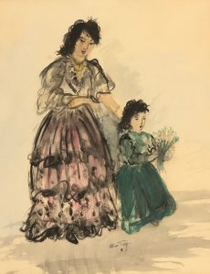 FREY (Alice). — "Les Gitanes". — Technique mixte sur papier, signée au milieu infér., montée sous passe-partout et cadre en bois. — Dim. cadre : 60 x 52 cm ; sujet : 40 x 33 cm.