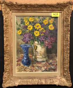 FRISON (Jehan). — "Lunaires et Seringas". — Huile sur panneau, signée au coin infér. droit, montée sous cadre doré en bois. — Dim. cadre : 55 x 45 cm ; sujet : 40 x 30 cm.