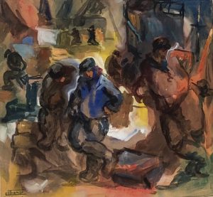 GIL FRANCO (Vicente). — "Marins-pêcheurs à Boulogne" (1952). — Aquarelle et gouache sur papier, située, datée et signée au coin infér. gauche, montée sous passe-partout et cadre doré en bois. — Dim. cadre : 51,5 cm x 54,5 cm ; sujet :...