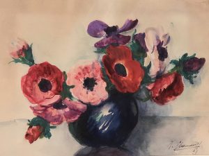 GLANSDORFF (Hubert). — "Anémones" (1928). — Huile sur papier, datée et signée, montée sous passe-partout et cadre doré en bois. — Dim. cadre : 47,5 x 57,5 cm ; sujet : 28 x 37,5 cm.
