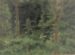 LYNEN (Amédée). — "Sous-bois". — Huile sur toile marouflée sur carton, datée et signée au coin infér. droit, montée sous passe-partout en tissu et cadre doré en bois. — Dim. cadre : 26 x 32 cm ; sujet : 18 x 24 cm.