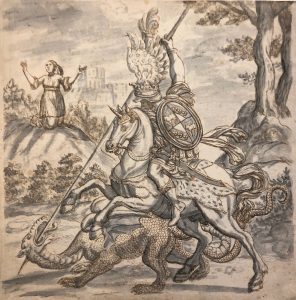 ANONYME. — "Saint Georges terrassant le dragon". — Dessin à l'encre sepia et au lavis sur papier vergé, monté sous passe-partout. Ecole Flamande du XVIIe. — Dim. passe-partout : 49,5 x 40 cm ; sujet : 29 x 28,5 cm (rousseurs, traces de...