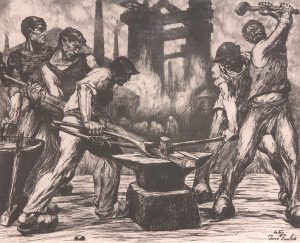PAULUS DE CHATELET (Pierre). — "Le Fer". — Eau-forte en noir, just. épreuve d'artiste et signée au crayon, montée sous passe-partout et cadre doré à liseré vert en bois. — Dim. cadre : 57 x 69 cm ; sujet : 40 x 49,5 cm.