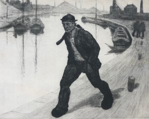 PAULUS DE CHATELET (Pierre). — "Le Haleur de la Sambre". — Eau-forte en noir, just. E.A., signée au crayon, montée sous cadre doré en bois. — Dim. cadre : 62 x 79,5 cm ; sujet : 40 x 50 cm.