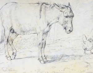 VERBOECKHOVEN (Eugène). — "Âne et poule". — Crayon sur papier fin, signé au coin infér. gauche, monté sous passe-partout de toile grise et cadre doré en bois. — Dim. cadre : 50,5 cm x 61 cm ; sujet : 39 cm x 48 cm (taches, papier lég....