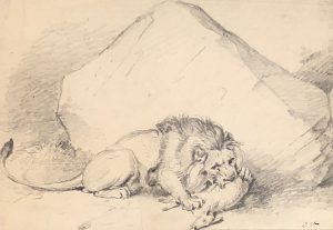 VERBOECKHOVEN (Eugène). — "Lion et gazelle". — Dessin au crayon, monogrammé au coin infér. droit, monté sous passe-partout et cadre doré en bois. — Dim. cadre : 39 x 50,5 cm ; sujet : 25,5 x 37,5 cm.