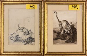 IDEM. "Etude de tigre attaquant un cheval". Encre sur papier, monogrammé au coin infér. droit, monté sous passe-partout et cadre doré en bois.