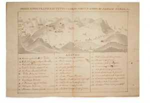 [ALPES-MARTIMES].[NICE (Comté de)]. Indice dimostrativo di tutti i luoghi forti e campi di Saorgio, Tenda &c. S. l. n. d., [Comté de Nice, première moitié du XVIIIe siècle]Plan sur un feuillet plié en deux, encre brune et lavis gris sur papier,...
