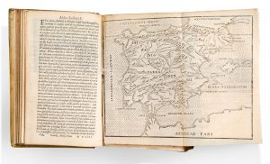 Boncompagni, est orné d'une vignette représentant le portrait de profil de Aldus Pius Manutius à la page de titre. Le verso présente la marque d'imprimeur de Alde Manuce le jeune, une ancre sous l'aigle impérial, dans un ornement avec le privilège de Maximilien II. Le texte De Bello Gallico est précédé de 20 illustrations gravées sur bois dont 6 hors-texte, 12 in-texte et 2 cartes dépliantes représentant l'Espagne et la Gaulle. Etat d'usage.