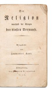 (Reliure de l'époque). Quelques légères rousseurs. Cartonnage un peu frotté. - Die Religion innerhalb der Grenzen der bloken Vernunft. Königsberg, Friedrich Nicolovius, 1793. In-12, broché, couverture de papier bleue de l'époque. Exemplaire broché, tel que paru. Des rous­seurs, manque de papier aux coiffes. Ex-libris gravé Robert de Billy.