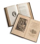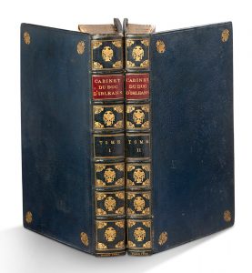 maroquin bleu, filet à froid, fleuron doré aux angles, dos orné, pièce de titre rouge, large dentelle intérieure, doublure de papier fort orné d'un fer à l'urne aux angles, tranches dorées (Reliure anglaise vers 1880). Édition originale. Superbe frontispice allégorique avec le portrait en médaillon du duc d'Orléans, gravé sur cuivre par Augustin de Saint-Aubin d'après Charles-Nicolas Cochin, un fleuron répété sur les titres, 2 vignettes en-tête, 179 planches de pierres gravées et 56 culs-de-lampe. Exemplaire provenant de la bibliothèque Edward Hailstone (1818-1890), bibliophile et antiquaire anglais. Il a figuré au catalogue de ce dernier (1891, n°1183), où il était annoncé comme étant relié en veau (old calf); depuis, il a été relié en maroquin dans le goût du XVIIIe siècle et l'ex-libris gravé du bibliophile a été recollé sur les contreplats. Une note au crayon indique que la reliure a été exécutée par Francis Bedford, praticien établi à Londres et mort en 1883. De la bibliothèque Robert de Billy, avec ex-libris. Frontispice et titres roussis. Traces de cire à la reliure.