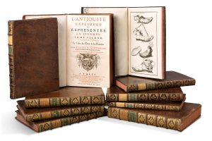 dos orné, pièces de titre citron et de tomaison verte, tranches rouges (Reliure de l'époque). Célèbre encyclopédie figurée de l'Antiquité, due à Bernard de Mont­faucon (1655-1741), bénédictin de la congrégation de Saint-Maur. Exemplaire comprenant environ 573 planches gravées en taille-douce (sur 977), dont quelques-unes se dépliant. Grand ex-libris armorié gravé du prélat Jean-Baptiste de Terme, à Vienne, daté 1778. Accroc à 2 feuillets au tome I avec perte de lettres (pp. 311-314), manque le faux-titre du tome I. Quelques mouillures. Frottements à la reliure, des mors fendus, une coiffe restaurée et deux autres accidentées.