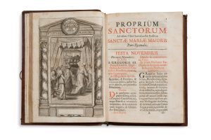 MISSELProprium sanctorum ad usum Cleri Sacrosanctae Patriarchalis Basilicae Sanctae Mariae Majoris. Pars Hyemalis. Rome, Antoine de Rubei, 1714. 4 parties en un volume in-4, basane fauve, roulette et fleuron aux angles, dos lisse orné (Reliure...