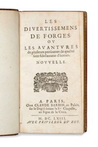 MOLIÈRE.-[COLLETET (François)]. Les Divertissements de Forges. Ou les Avantures de plusieurs personnes de qualité sont fidellement d'écrites. Nouvelle. Paris, Claude Barbin, 1663. In-12, maroquin rouge, janséniste, titre doré au dos, dentelle...