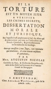 NICOLAS (Augustin) Si la torture est un moyen seur à vérifier les crimes secrets;dissertation morale et juridique. Amsterdam, Abraham Wolfgang, 1682. In-8, vélin rigide de l'époque. Seconde édition, après l'originale parue un an plus tôt, de...