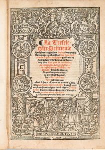 filet à froid, dos orné, pièce de titre rouge, roulette intérieure, tranches dorées sur marbrure (Reliure du XVIIIe siècle).Bechtel, P-93. seconde et dernière édition gothique de ce roman de chevalerie. Imprimée en caractères gothiques, elle est ornée de 6 titres placés dans des encadre­ments gravés sur bois de style bâlois, celui du premier tome imprimé en noir et rouge, et d'une grande figure sur bois représentant l'adoubement d'un chevalier par un roi. Ex-libris armoriés gravés du comte de Ayles­ford et de Richard de Loménie. Manquent 4 feuillets dans le troisième volume (5e tome, ff. L2 à L5). Reliure très usagée, les premiers plats détachés.