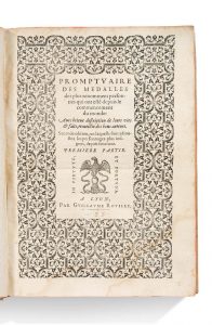 ROUILLE (Guillaume)Promptuaire des médailles des plus renommées personnes qui ont esté depuis le commencement du monde: avec brieve description de leurs vies & fais, recueillie des bons auteurs. Lyon, Guillaume Rouille, 1577.In-4, plein vélin...