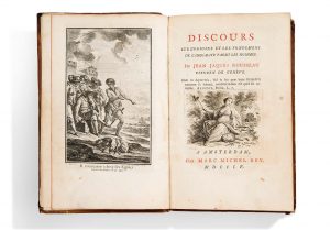 l'époque). Edition originale de l'un texte fondateur de la pensée philosophique politique moderne. Exemplaire sur papier fort. Après une première réponse brillante en 1750, dans son discours sur l'Action des sciences et des arts sur les moeurs, Rousseau rédige en 1753, une synthèse de ses théories afin d'apporter une réponse à la question posée par l'Académie de Dijon «Quelle est l'origine de l'inégalité parmi les hommes, & si elle est autorisée par la Loy naturelle.» Véritable reflet de ses convictions, Rousseau expose sa vision de l'homme et du monde avec cette idée forte selon laquelle la société, fondée sur la propriété, serait la cause de l'inégalité et de la corruption des hommes. Il tend à montrer que la propriété et l'appât du gain éloigne l'homme de sa vraie nature et que faute de revenir à l'innocence primitive, il deviendra sa propre source de malheur et de décadence «Le premier qui ayant enclos un terrain, s'avisa de dire ceci est à moi & trouva des gens assés simples pour le croire, fut le vrai fondateur de la société civile.» (p.95) La gravure en frontispice, signée Eisen, illustre parfaitement le paradoxe de cette éducation qui tend à la régression: un homme sauvage, après avoir reçu une éducation complète, retourne chez les siens, ses Egaux. Il quitte la société des hommes policés, renonce à la religion chrétienne, rend ses riches vêtements pour revêtir une peau de brebis et retrouver les manières et usages de ses ancêtres. Rousseau présente ici pour la première fois sa vision complète de l'homme et du monde, et bouleverse la philosophie politique de son siècle et celle de ses contemporains, sou­levant des controverses notamment de la part de Voltaire qui lui répondra dans une lettre en 1755 «On n'a jamais employé tant d'esprit à vouloir nous rendre Bêtes. Il prend envie de marcher à quatre pattes quand on lit votre ouvrage.». Bel exemplaire de cette édition originale complète du frontispice dessiné par Eisen et gravé par Sornique, de la vignette de titre et de l'entête de dédicace aux armes de la République de Genève signés Fokke. On trouve en outre à la page 11, la correction à la plume du libraire Rey au mot «conformé» qui en rajouta l'accent aigu. (Dufourn n°55) Bords et coins émoussés, épidermures au dos, mors fendu, manque à la coiffe, mouillures.