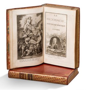 VOLTAIRELa Henriade. Paris, Veuve Duchesne, Saillant, Desaint, Panckoucke et Nyon, 1770. 2 volumes in-8, maroquin rouge, triple filet, fleuron aux angles, dos orné à la grotesque, pièces de titre brune et de tomaison verte, roulette intérieure,...