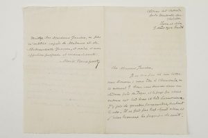 Elle l’imagine à Chamonix alors qu’elle se trouve en Touraine, où elle fait de grandes promenades le soir : « j’aime beaucoup les paysages de nuit. Et, en ce moment, le ciel est splendide, tout scintillant d’étoiles. C’est bien le plus beau spectacle qu’on puisse voir ; je le vois tous les soirs, et, tous les soirs, en le voyant, je pense à vous. La voie lactée est admirable maintenant, et Jupiter très brillant. – Mais bientôt la lune va venir et nous aurons de beaux clairs de lune pour nos promenades : j’ai déjà vu le petit croissant peu après le coucher du soleil. Je n’ai rien à faire ici qu’à me promener, lire, faire de la musique et écrire, apprendre pour vous tout ce que vous voudrez. – Vous savez comme je prends à cœur de vous contenter dans tout ce que je puis, puisque vous voulez bien vous intéresser à moi. […] Au Mont Blanc, fait-on en ce moment beaucoup d’observations ? Il va bientôt y avoir les étoiles filantes d’août : dans ma dernière promenade j’en ai déjà vu une quantité plus grande que de coutume »…{CR} On joint 4 L.A.S., une L.S. et une invitation de son père, le géographe Roland Bonaparte, à Janssen, 1891-1904.