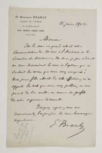 26 juin 1902. Il a lu avec un grand intérêt la communication de Janssen à l’Académie sur la correction du kératocône, et demande « le nom de l’opticien qui a construit les verres que vous avez imaginés ? Une jeune fille atteinte de cette affection, m’a apporté la note que vous avez publiée, en me priant de la mettre en mesure de profiter de votre ingénieuse découverte »…{CR} 30 octobre 1920. « Fidèle à la haute mémoire de Monsieur Janssen, M. Branly regrette de n’être pas en état d’assister à l’inauguration du monument qui rappellera à tous les impérissables travaux du Grand Astronome »… 21 février 1922. Remerciements pour les discours prononcés à l’inauguration de la statue de Janssen. « La statue perpétuera pour tous le souvenir du fondateur de l’Astronomie physique et elle rappellera à ceux qui l’ont connu son bienveillant accueil »…