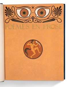 rouge, de motifs géométriques mosaïqués aux angles et de guirlandes dorées, gardes de faille bleue, tranches dorées, non rogné, couverture, étui (Ch. Septier). Belle édition publiée d'après une maquette typographique de François-Louis Schmied, illustrée de compositions de Georges Barbier gravées sur cuivre et imprimées en couleurs. Tirage unique à 150 exemplaires. Exemplaire comprenant à la fin du volume une des rares doubles suites sur japon mince des illustrations, en noir et en couleurs (tirage à 25 exemplaires). Bel exemplaire en maroquin doublé et mosaïqué de Septier. De la bibliothèque Étienne Beauvillain, avec ex-libris.