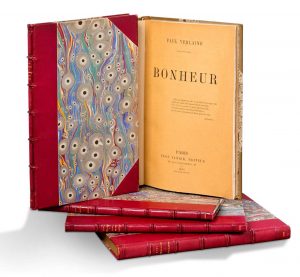 filets estampés à froid, têtes de tranches dorées, non rognés, couvertures et dos conservés (Reliure Huser) et dernier volume, bradel à coins en cartonnage percaline moutarde et papier marbré, dos lisse titré or, couverture conservée (Reliure non signée). Editions originales de ses derniers recueils en vers et en proses, illustrant un déchirement perpétuel entre les «sages» et impossibles résolutions et les rechutes dans le vice et le «péché». Le poème «Chasteté» destiné à paraître dans Bonheur est encarté à la fin de Parallèlement entre les pages 114 et 115. Exemplaires et reliures en bon état.ProvenanceEx-libris Robert Moreau.