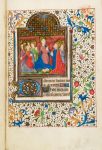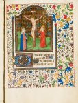 Une mention au crayon indique “Armoiries de Pierre Fitzjean. 1736”: les armes sur les plats ont pu être rajoutés à la génération suivante, par exemple par un de ses fils (Etienne, mort en 1751; André, mort en 1747). Il eut un autre Pierre Fijan de Talmay, conseiller au Parlement de Bourgogne, né en 1714, conseiller au Parlement de Bourgogne, qui épousa Françoise de la Toison: elle fit rentrer dans le patrimoine des Fijan l'Hôtel de la Toison à Dijon. 3. Vignette ex-libris imprimée du XVIIIe s.: “B. Riambourg, Prêtre.” Il s'agit sans nul doute de Bernard Riambourg (mort en 1838), né à Vitteaux en 1747 (Chomton (1900), 328). Il fut vicaire de Notre Dame de Dijon. On conserve un autre ouvrage avec cet ex-libris à la Pierpont Morgan Library: Bibliotheca Fayana (Paris, 1725). Texte f. i, feuillet blanc; f..ii, Armoiries peintes de Pierre Fijan (Fitzjean) avec les initiales P F surmontées d'une banderole avec la devise “Duce sydere coelum crux dabit”. Les armoiries se blasonnent comme suit: D'azur au chevron d'or accompagné de trois étoiles de même, au chef d'azur, chargé de trois croix pattées de gueules. ff. 1-12v, Calendrier (usage de Besançon); signalons les saints suivants: Prothadius, évêque de Besançon (10 février); Desiderius, évêque de Vienne (11 mai); Ferreolus et Ferrucius (translation des reliques, 30 mai); Claude, évêque de Besançon (6 juin); Ferreolus et Ferrucius (Passion, 16 juin); Mammes (17 août); Ferreolus et Ferrutius (invention des reliques, 5 septembre); Rémi d'Auxerre (1 octobre). ff. 13-16v. Péricopes évangéliques; ff. 17-54. Heures de la Vierge (à l'usage de Besançon), avec matines (fols. 17r-26r); laudes (fols. 26r-35v); prime (fols. 36r-39r); tierce (fols. 39r-41v); sexte (fols. 41v-44v); nones (fols. 44v-46v); vêpres (fols. 46v-50v); et complies (fols. 50v-54r); f. 54v, feuillet blanc; ff. 55-58, Heures de la Croix; ff. 58v, feuillet blanc; ff. 59r-61v. Heures du Saint Esprit; ff. 62-62v, feuillets blancs; ff. 63-78v, Psaumes de la pénitence, suivis des Litanies (ff. 74-77), et prières; signalons dans les litanies la présence des saints bisontins saints Ferreolus and Ferrucius; saint Prothadius de Besançon et saints Gengulph et Nazarius. ff. 79-91, Ofiice des morts, forme abrégée avec trois leçons pour matines; ff. 91v-93v, Obsecro te, forme masculine; ff. 94-96, O intemerata; ff. 97-97v, feuillet blanc.Illustration Cinq grandes miniatures: f. 17, Annonciation; f. 55, Crucifixion entre Marie et Jean l'Evangéliste; f. 59, Pentecôte; f. 63, David en prière f. 79, La mort portant un cercueil (Office des morts): cette représentation est relativement rare, on citera par exemple celles dans les manuscrits de Philadelphie, Free Library MS Lewis E128 et Manchester, John Rylands Library MS Latin 38. Bibliographie Avril, F. and N. Reynaud, Les manuscrits à peintures en France 1440-1520 (Paris, 1993).-Avril, F., Hermant, M. et al. Très riches Heures de Champagne (Paris, 2007).-Château de Talmay-[Commission des Antiquités], “Messire Pierre Fijan, chevalier, baron de Talmay, 1698,” Mémoires de la Commissions des Antiquités de Département de la Cote d'Or 11 (1885), lxvi.-Chomton, L. Histoire de l'église Saint-Bénigne de Dijon. Dijon, 1900.