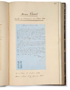 en un fort volume in-fol. relié demi-chagrin noir (rel. usagée). Ad. Adam, Dr Alibert, Andrieux, comte d'Argout, J. Babinet, V. Baltard, Béclard, H. Berlioz, Berryer, Beulé, Dr Blanche, Blanqui, G. Boissier, Bory Saint-Vincent, M. Bréal, V. et A. de Broglie, E. Caro, Champollion-Figeac, Michel Chevalier, Dr Civiale, Clapisson, Étienne Clavier, L. Cogniet, G. Cuvier, Cuvillier-Fleury, Aug. Daubrée, C. Doucet, Paul Dubois, Dupin aîné, Ch. Dupin, Dupuytren, Amaury Duval, E. Egger, O. Feuillet, Flourens, P.F.L. Fontaine, L.B. Francoeur, Gail, Geoffroy Saint-Hilaire, Pierre-Simon Girard, Golbéry, Jomard, Lamartine, Langlès, Legouvé, Nép. Lemercier, M. Lévy, Magendie, Meyerbeer, Monmerqué, Moreau de Jonnès, Nieuwerkerke, Nisard, Paulin Paris, Dr Pariset, Pongerville, Pougens, Quételet, Raoul-Rochette, Ravaisson, Dr Ch. Robin, Sainte-Beuve, E. Salverte, F. de Saulcy, Scribe, Simonde de Sismondi, Sully-Prudhomme, baron Taylor, Tissot, Horace Vernet, A. de Vigny. Collection du Baron de BONNEMAINS (avec son ex-libris, et tampon à ses armes sur la plupart des lettres). [Henri-Pierre-Édouard de Bonnemains (1821-1898) fut le premier maire du XVIe arrondissement de Paris (1860-1870).]
